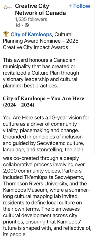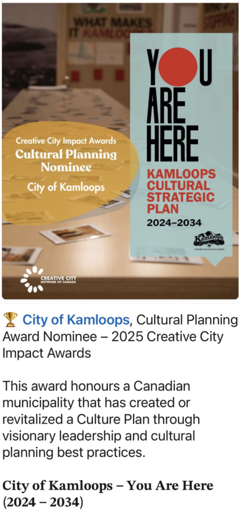 The Community and Cultural Research Group is thrilled to see the You Are Here Kamloops Cultural Strategic Plan nominated for the Creative City Network of Canada Impact Award.